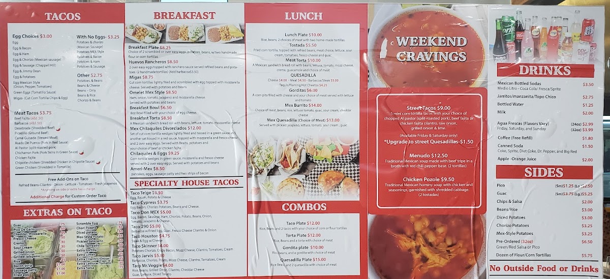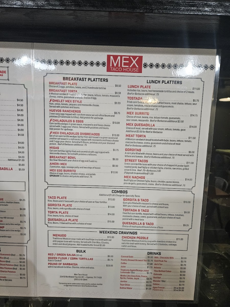Welcome to MEX Taco House, where every bite tells a story of flavor and tradition. Located at 25410 Northwest Fwy, Cypress, TX, this taco haven has quickly become a local favorite. Known for its generous portions, the menu features a delightful array of tacos, expertly crafted with your choice of meats atop homemade tortillas that are nothing short of perfection.